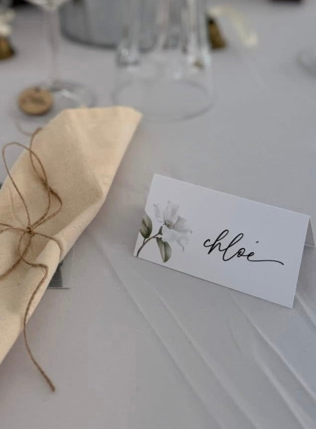 Joli marque-place, parfait pour identifier les lieux attribués de vos invités. Vous pouvez également y inscrire le choix de menu et/ou allergies de chacun afin de faciliter la tâche aux serveurs/serveuses.